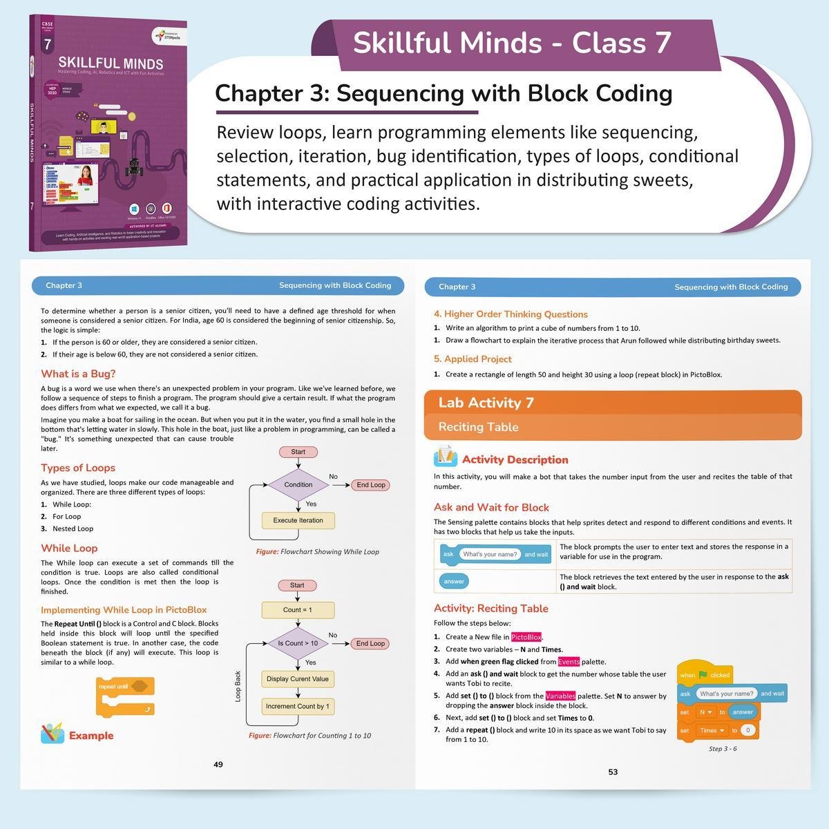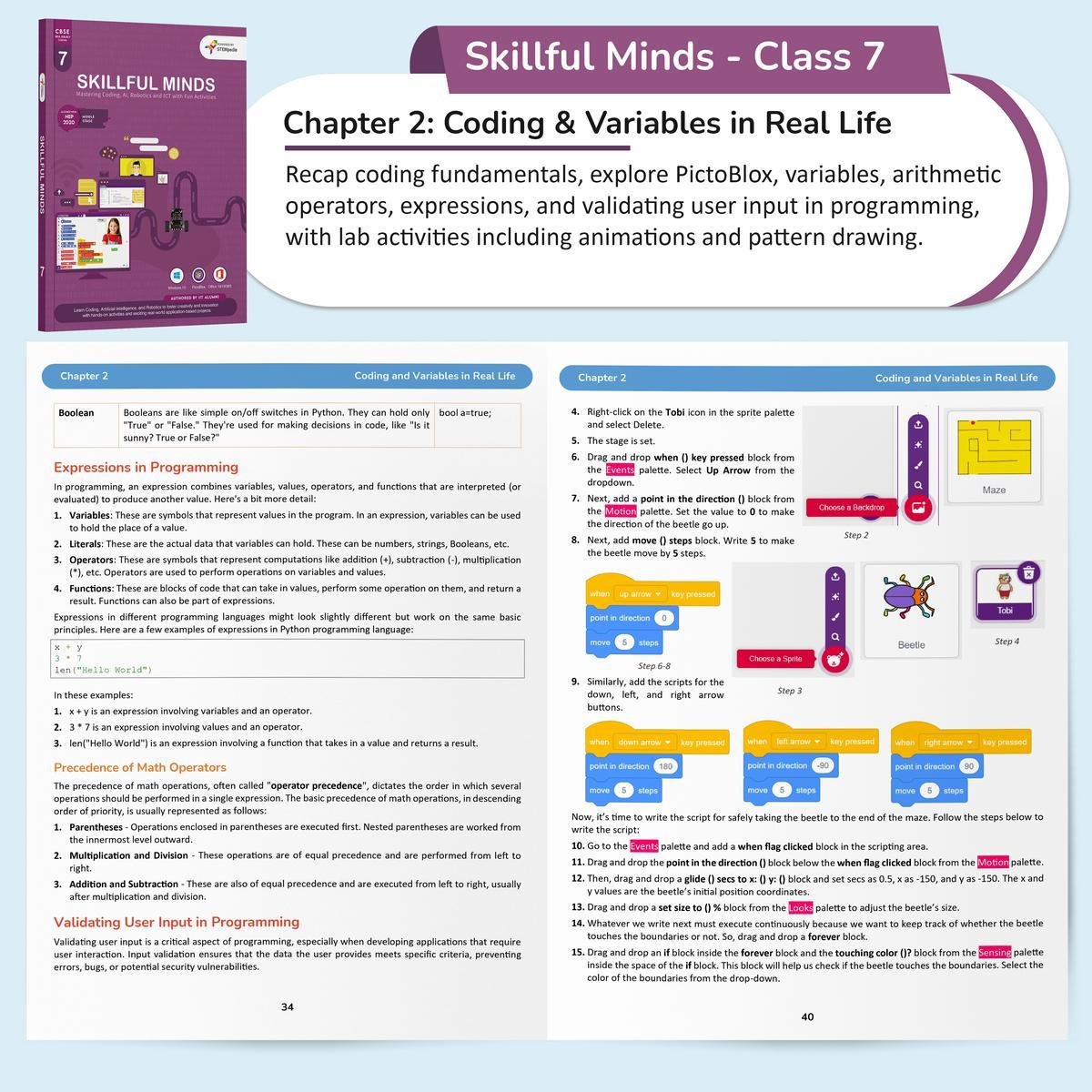 Skillful Minds for Class 7 is a complete and engaging educational resource designed to deepen studentsunderstanding of Information and Communication Technology. Aligned with the CBSE curriculum and the Class 7 Coding Skill Subject (Chapters 2), the book covers key areas such as coding, algorithm development, advanced MS Office tools, fundamentals of Artificial Intelligence and Robotics, and introductory HTML. All topics are reinforced through hands-on lab activities that encourage real-world application and interactive learning.