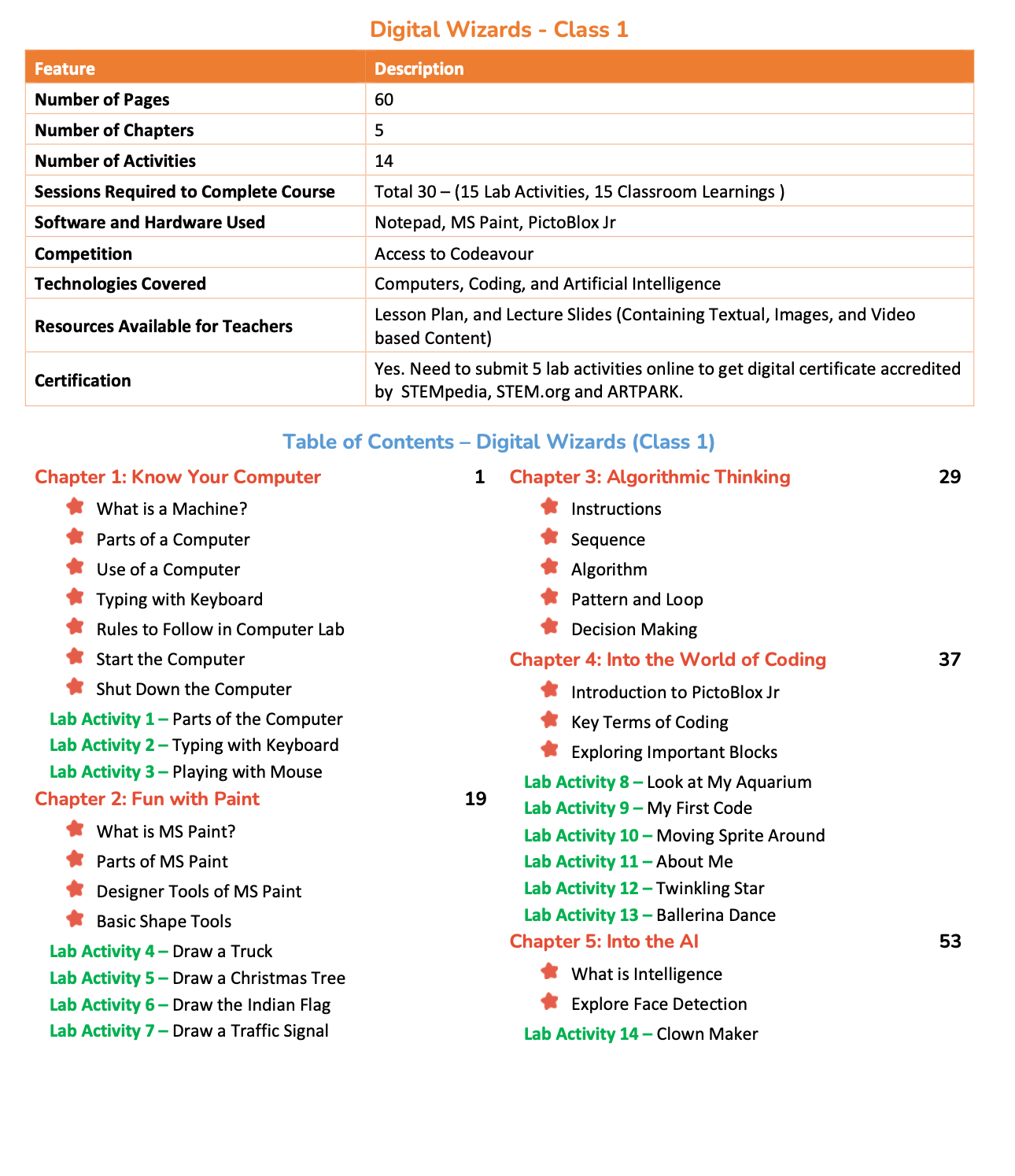 The course spans 60 engaging pages divided into 5 well-structured chapters, with a total of 14 interactive activitiesthat build foundational digital skills step by step. It is delivered across 30 sessions, equally balanced between 15 classroom learning sessions and 15 practical lab activities, ensuring an effective blend of theory and practice.