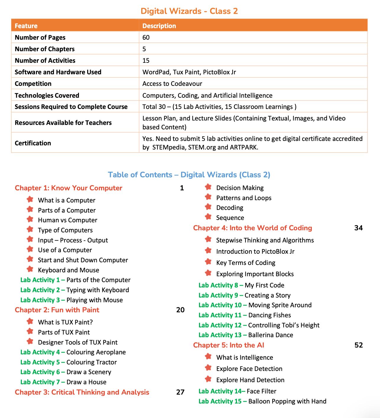 The course includes 60 pages of structured content across 5 thoughtfully designed chapters, featuring 15 hands-on activities that encourage exploration, problem-solving, and creative expression. Learning is delivered over 30 sessions, evenly divided into 15 classroom lessons and 15 practical lab sessions, ensuring a balanced and interactive learning experience.