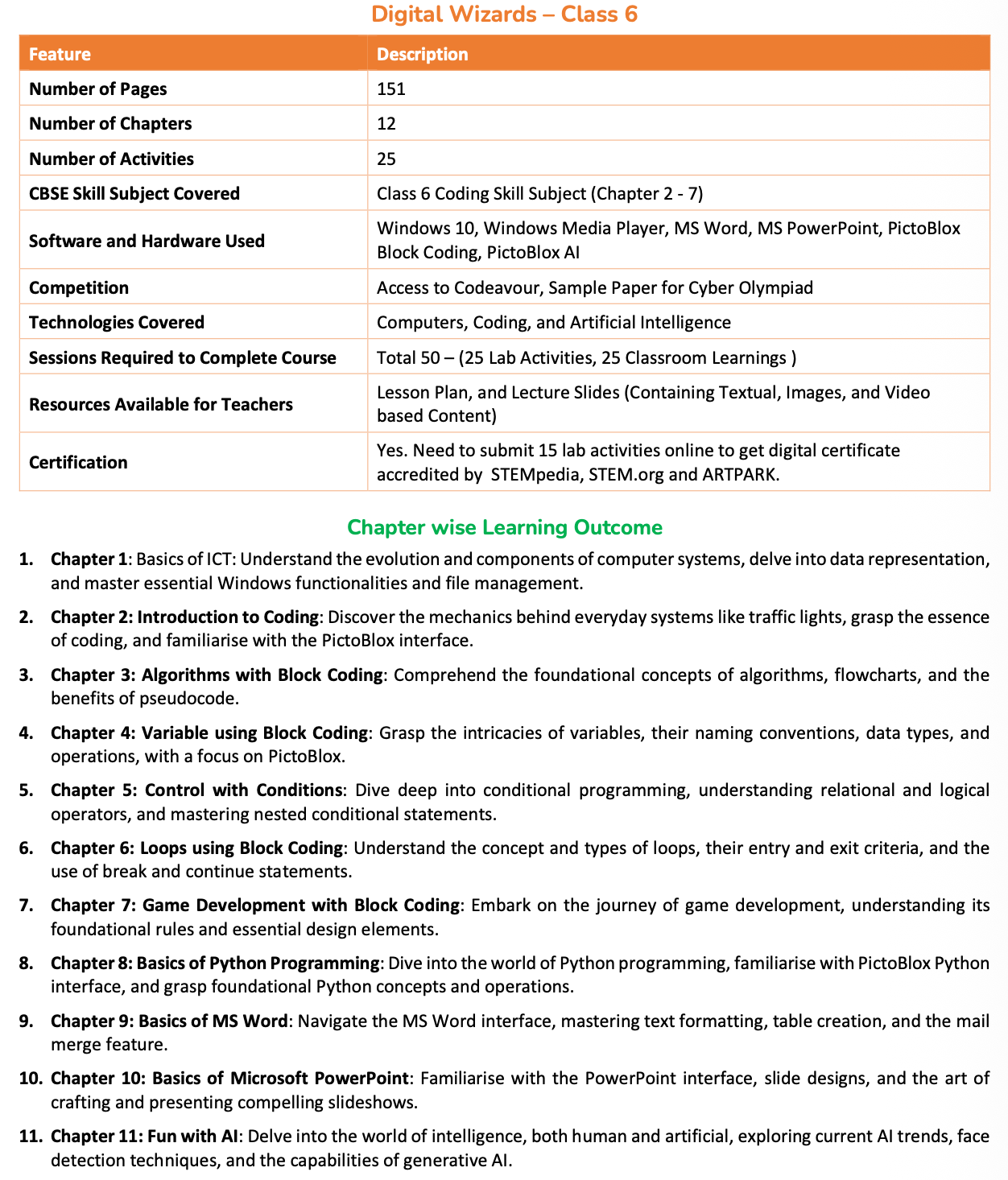 Digital Wizards – Class 6 is a robust, curriculum-aligned program designed to help students transition from block-based logic to structured programming, while building a strong foundation in computing, artificial intelligence, productivity tools, and internet technologies.