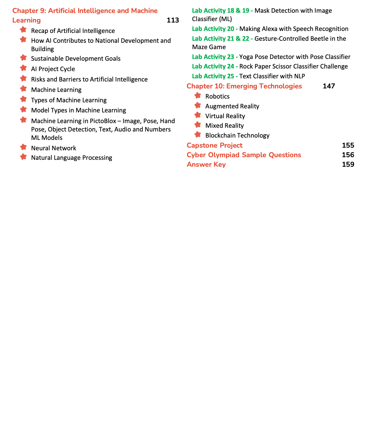 Aligned with the CBSE Class 8 Coding Skill Subject (Chapters 2–6) and the Class 8 Artificial Intelligence Skill Subject (Chapter 9), students work with advanced tools and platforms such as Windows 10, Canva, MS Excel, PictoBlox Block Coding, PictoBlox Python Coding, PictoBlox Machine Learning, and PictoBlox AI. The curriculum covers ICT fundamentals, Python programming, conditions and loops, functions, arrays, data analysis and data science, artificial intelligence, machine learning, and emerging technologies including robotics, AR/VR, and blockchain. Learners also receive access to the Codeavour competition and Cyber Olympiad sample papers, supporting competitive exposure and assessment readiness.
