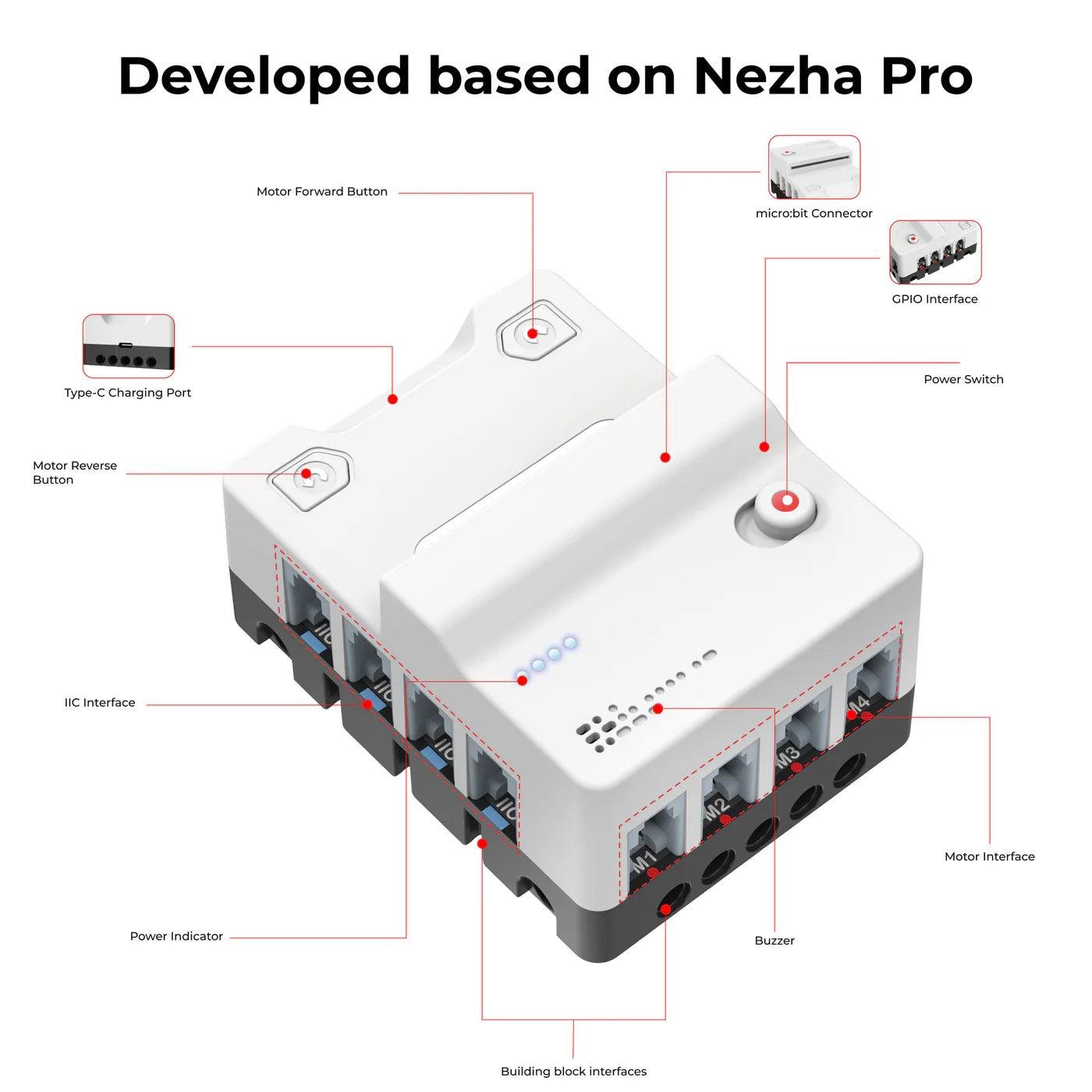 • Nezha Pro controller breakout board featuring 8-way sensor interface and 4-way closed-loop motor interface with fool-proof RJ11 connectors/p>