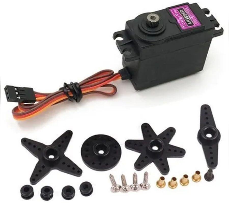 The MG996R High-Torque Digital Servo comes with metal gears, delivering an impressive stalling torque of up to 10 kg in a compact design. This servo is an enhanced version of the popular MG995, featuring improved shock resistance, a redesigned PCB, and a more precise IC control system for greater accuracy.