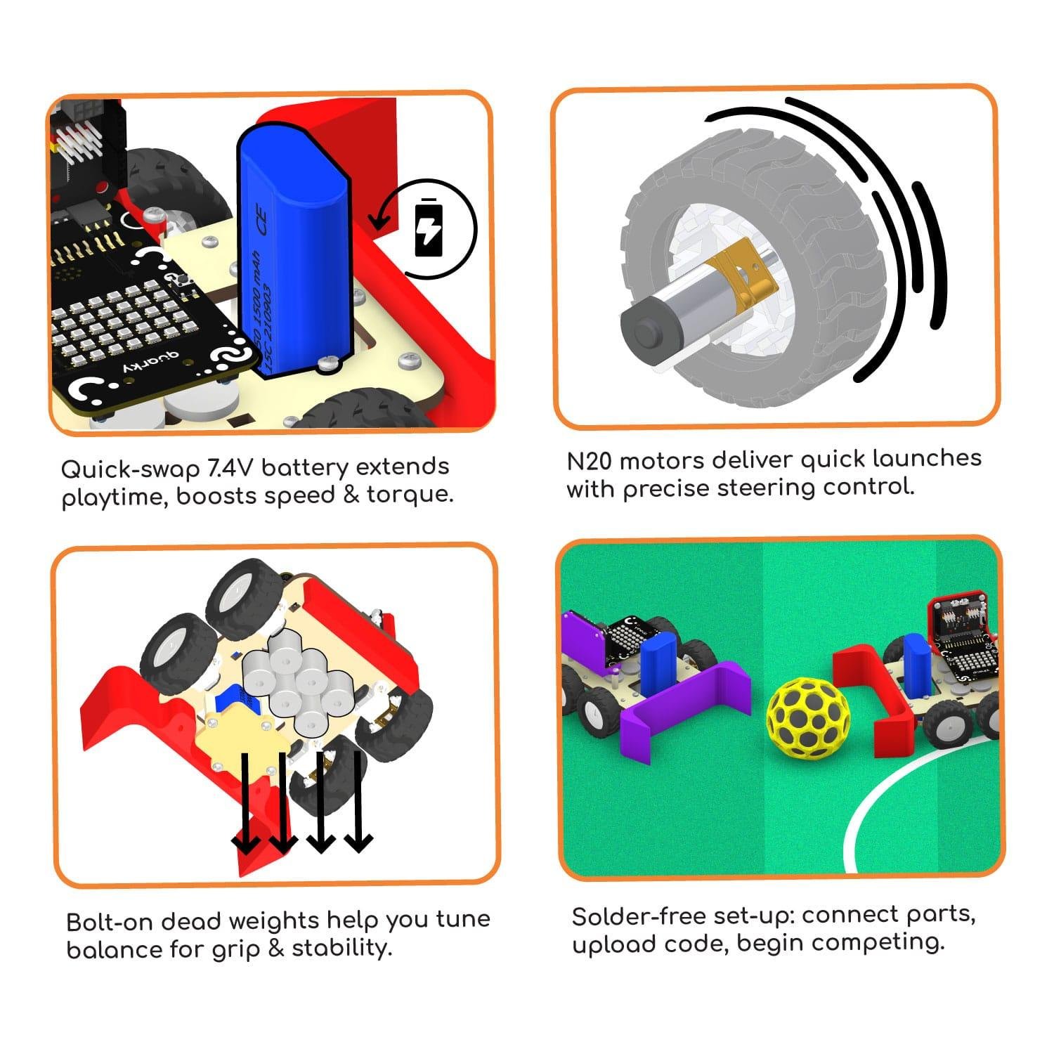 Includes 4 high-speed motors with wheels, a sturdy chassis with claw, dual batteries (7.4V and 3.7V), Quarky Board with Expansion Board, charger, USB cable, and dead weights. Every component is selected for reliable performance and smooth assembly.